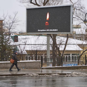 3月23日,俄罗斯远东城市符拉迪沃斯托克街头的广告牌播出蜡烛图案,悼念莫斯科近郊恐袭事件遇难者。