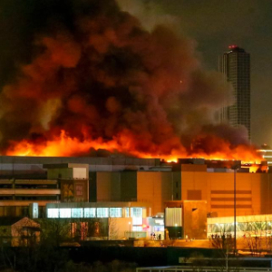 这是3月22日在俄罗斯莫斯科近郊克拉斯诺戈尔斯克市拍摄的火光中的“克罗库斯城”音乐厅。