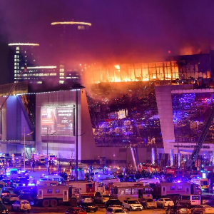 3月22日,俄罗斯莫斯科近郊克拉斯诺戈尔斯克市一音乐厅发生枪击事件后引发火灾。新华社记者曹阳摄
