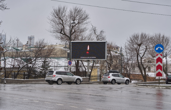 3月23日,俄罗斯远东城市符拉迪沃斯托克街头的广告牌播出蜡烛图案,悼念莫斯科近郊恐袭事件遇难者。 新华社发 郭飞洲 摄