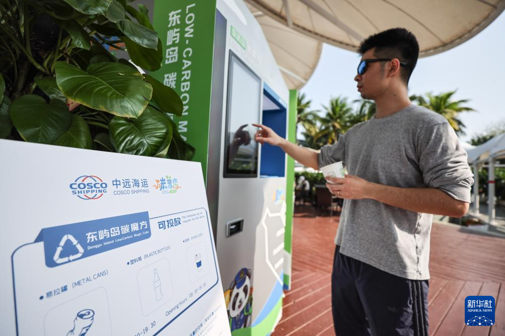 3月22日,游客在博鳌东屿岛的零碳休息区体验回收设备。