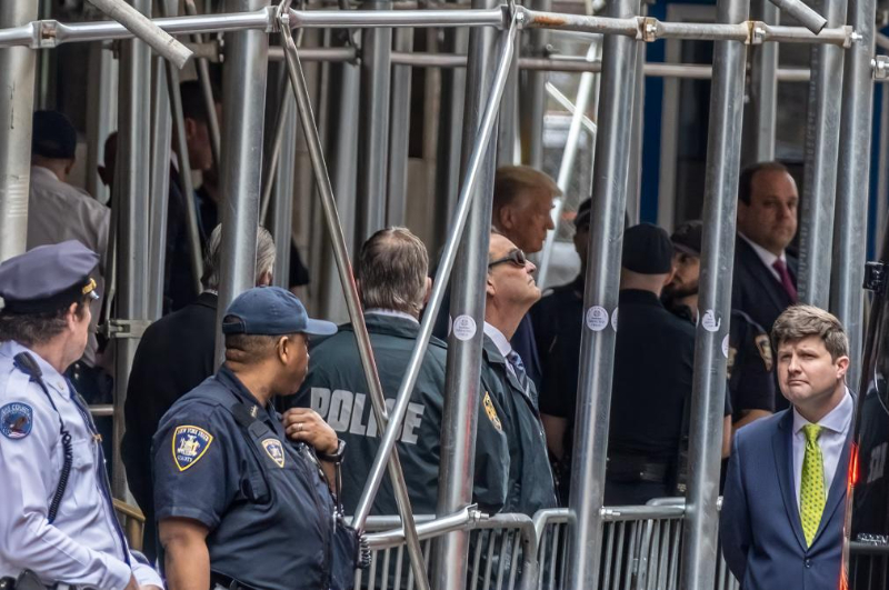 2023年4月4日,美国前总统特朗普在纽约出庭后离开。新华社发(周焕新摄)