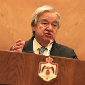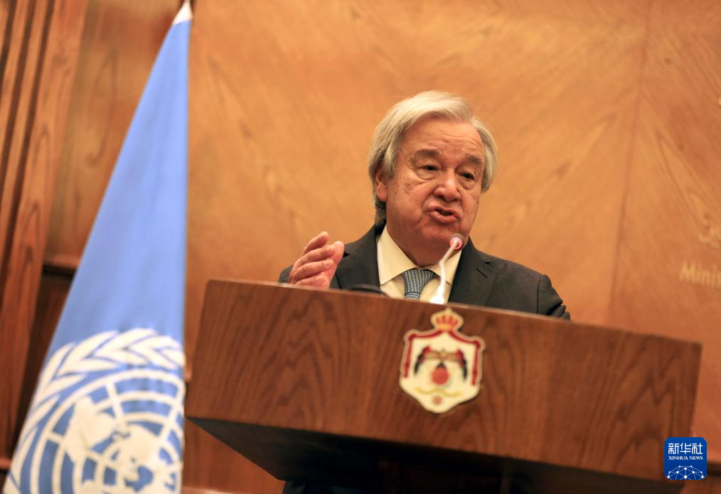 3月25日,在约旦首都安曼,联合国秘书长古特雷斯在与约旦外交大臣萨法迪举行的联合新闻发布会上讲话。