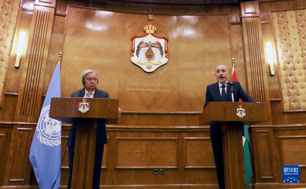 3月25日,在约旦首都安曼,联合国秘书长古特雷斯(左)与约旦外交大臣萨法迪召开联合新闻发布会。