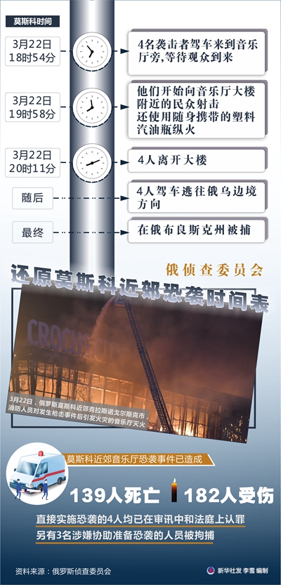 新华社莫斯科3月25日电(记者江宥林 刘恺)俄罗斯侦查委员会主席巴斯特雷金25日向总统普京汇报说,莫斯科近郊音乐厅恐袭事件已造成139人死亡、182人受伤。他详细还原了此次袭击的时间表。