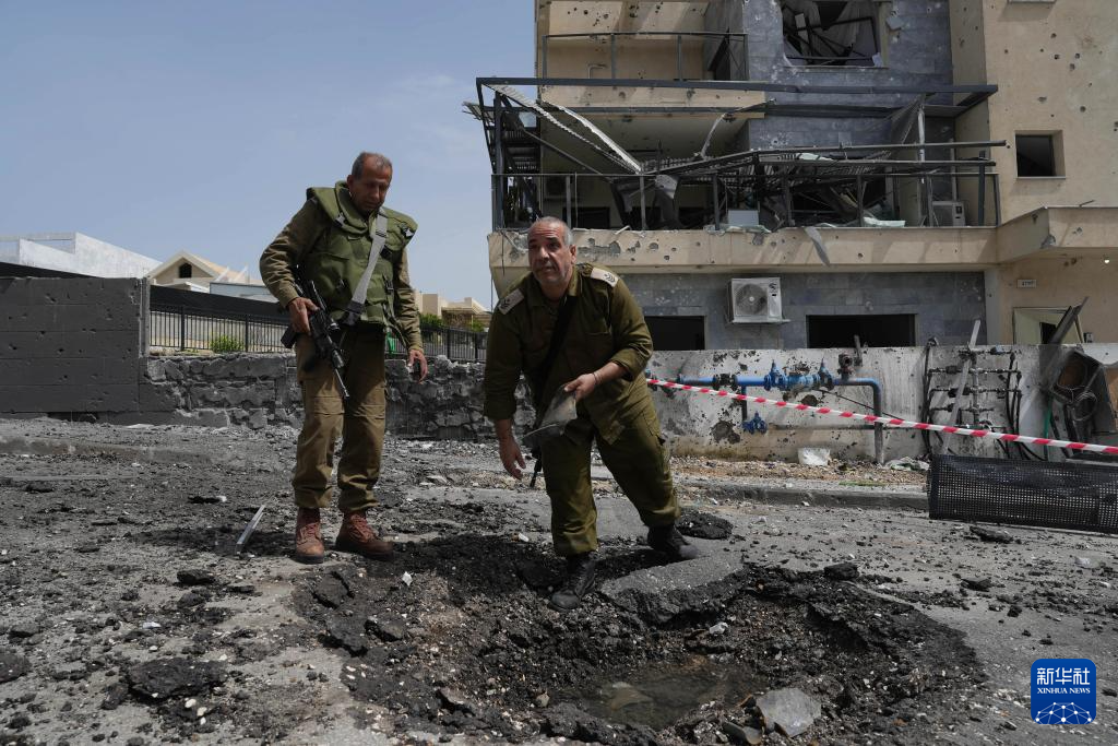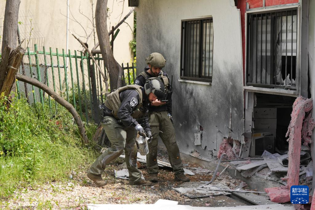 3月27日,以色列安全人员在以色列北部城市谢莫纳检查一处遭火箭弹袭击的建筑。