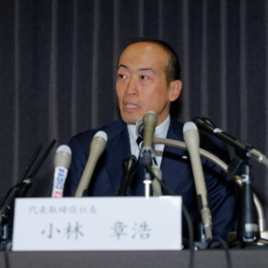 3月29日,小林制药公司社长小林章浩(左二)在日本大阪举行的新闻发布会上讲话。