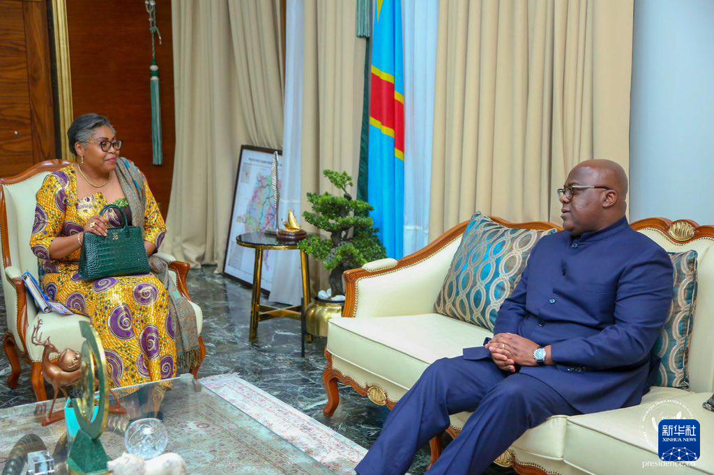 4月1日,在刚果(金)首都金沙萨,总统齐塞克迪(右)接见新任总理图卢卡。新华社发(刚果民主共和国总统府供图)