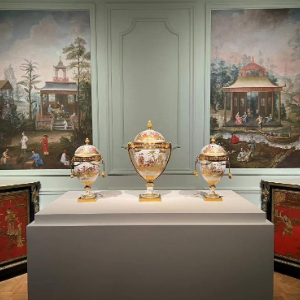 展厅正中,复刻路易十五王后玛丽·莱什琴斯卡私人房间“中国人厅”的展陈精致非常。绘制中国人物形象的法国产瓷瓶、镶嵌了中国漆版的墙角柜,正无声诉说着当年法国贵族们对中国艺术的追捧和热爱。
