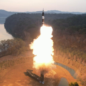 这张朝中社提供的照片显示的是导弹发射升空画面。