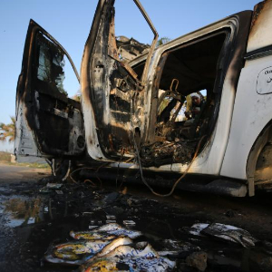 这是4月2日在加沙地带中部代尔拜拉赫拍摄的被毁的汽车。
