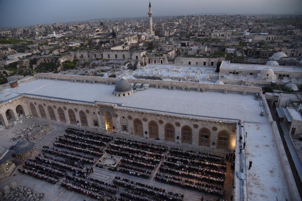 3月30日,在叙利亚北部城市阿勒颇,人们在尚未修复完成的倭马亚清真寺参加慈善开斋饭活动。(蒙塞夫摄)