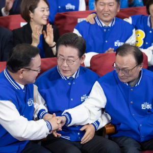 4月10日,在韩国首尔,韩国最大在野党共同民主党党首李在明(前排中)与共同民主党领导层共同庆祝出口民调结果大幅领先。
