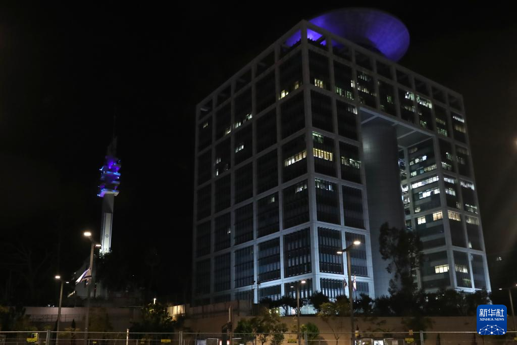 这是4月13日在以色列特拉维夫拍摄的以色列国防部建筑。