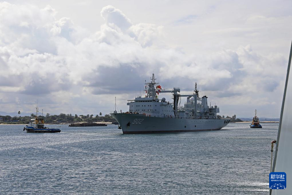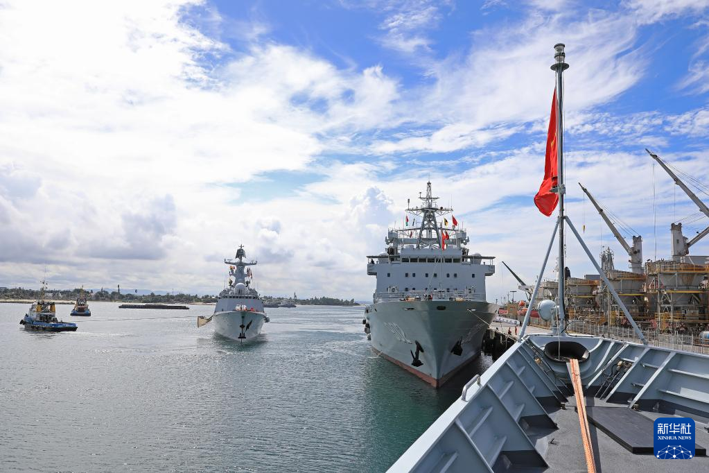 中国海军第45批护航编队结束对马达加斯加友好访问,离开图阿马西纳港(4月14日摄)。新华社发(王远方摄)