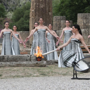 4月16日,扮演最高女祭司的演员玛丽·米娜(前右)点燃第一棒火炬手——希腊运动员、东京奥运会男子赛艇项目金牌得主斯特凡诺斯·恩图斯科斯手中的火炬。