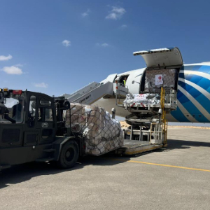 4月19日,工作人员在埃及阿里什机场卸载中国援助巴勒斯坦的物资。