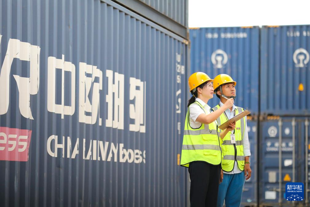 4月11日,在中老铁路老挝万象南站货场,中老员工一同核验集装箱。新华社发(杨永全摄)