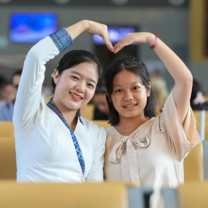 4月15日,在中老铁路老挝琅勃拉邦站,车站工作人员与旅客合影。