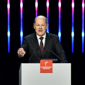 4月21日,德国总理朔尔茨在德国汉诺威工业博览会开幕式上致辞。新华社记者 任鹏飞 摄