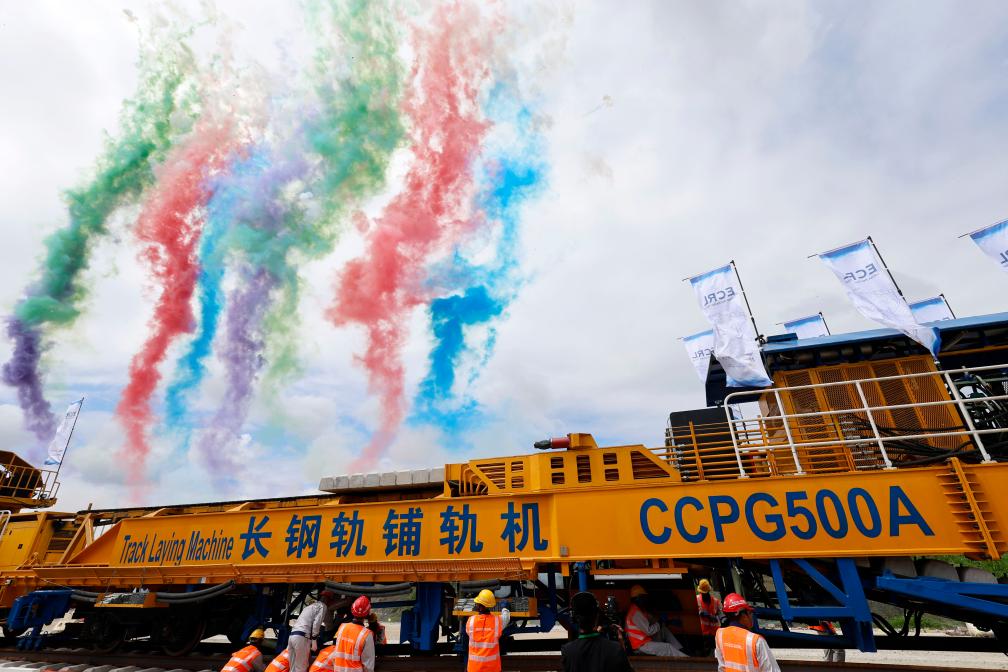 这是2023年12月11日在马来西亚彭亨州首府关丹市拍摄的马来西亚东海岸铁路(马东铁)项目轨道工程启动仪式现场。新华社发(张纹综摄)