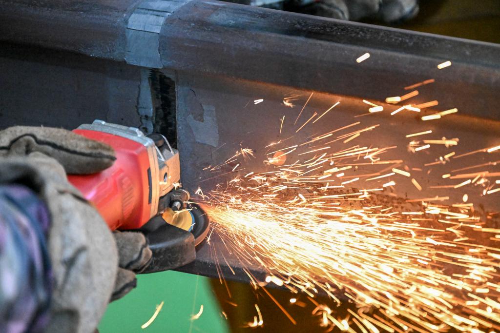 这是2023年11月19日在马来西亚关丹市郊的马东铁项目焊轨场拍摄的铁轨打磨瞬间。新华社记者程一恒摄