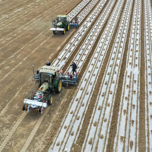 在新疆阿克苏地区阿瓦提县高标准农田核心示范区,搭载导航自动驾驶系统的精量播种机在棉田春播(3月27日摄,无人机照片)。新华社记者丁磊摄