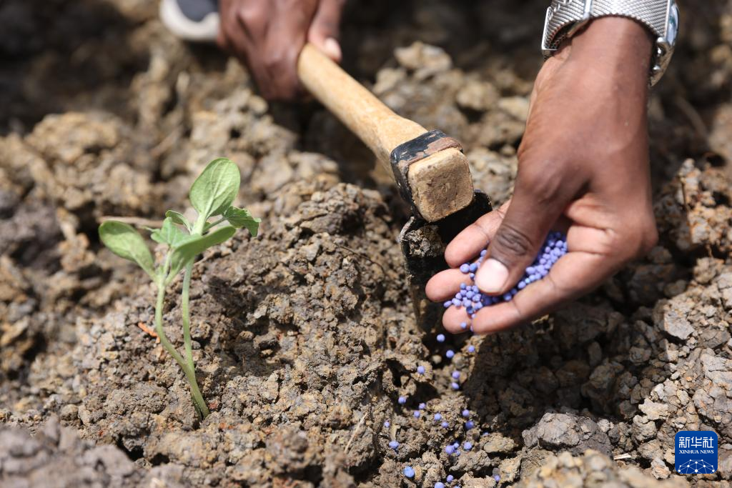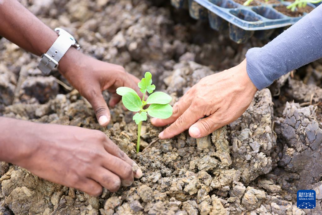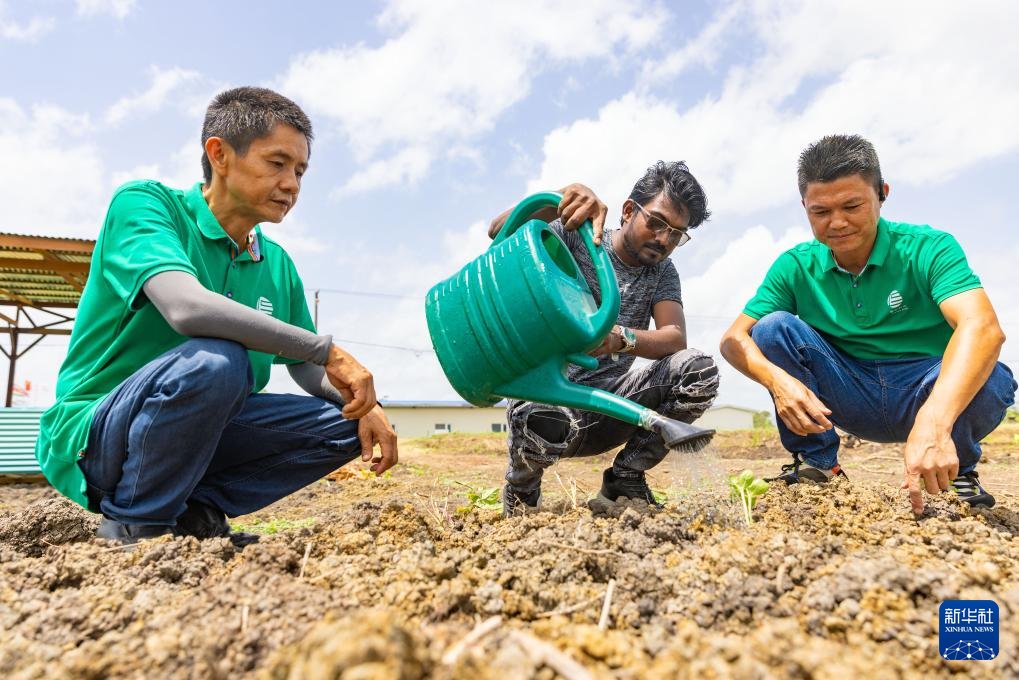 4月5日,在苏里南萨拉马卡区农户阿什温·杜基家的田地里,中国农业技术专家与农户杜基一起,将西瓜秧苗移栽到地里并施肥。