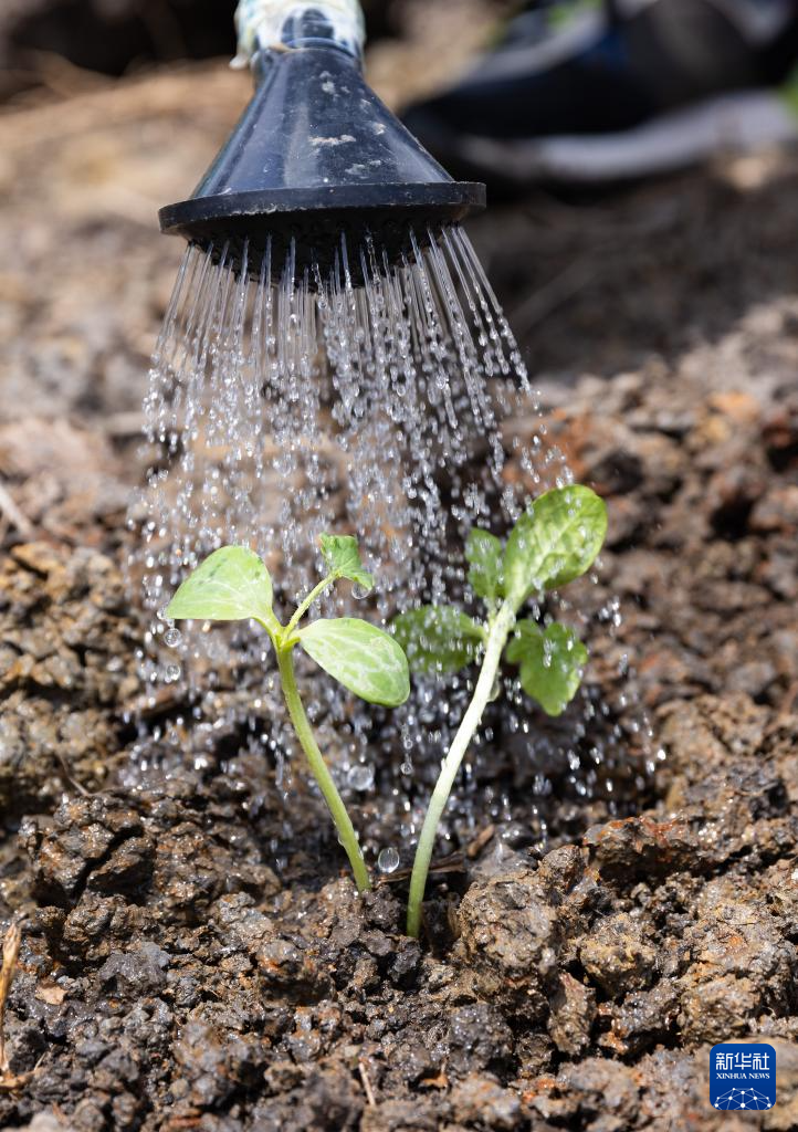 4月5日,在苏里南萨拉马卡区农户阿什温·杜基家的田地里,中国援苏里南农业技术合作中心农艺师杜时云(右)、刘经国(左)与农户杜基一起,给刚移栽到地里的西瓜秧苗浇水。