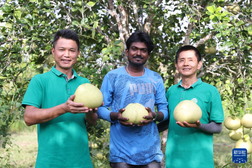4月5日,在苏里南萨拉马卡区农户阿什温·杜基家的果园里,中国援苏里南农业技术合作中心的农艺师杜时云(左)、刘经国(右)与农户杜基合影。