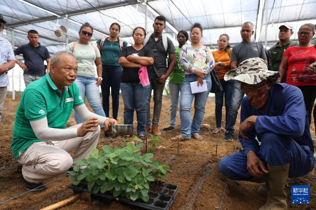 4月3日,在位于苏里南萨拉马卡区的中国援苏里南农业技术合作中心,农业专家在大棚讲解秧苗移栽技术。