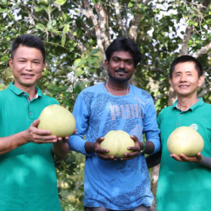 4月5日,在苏里南萨拉马卡区农户阿什温·杜基家的果园里,农户杜基(左一)在收获柚子。