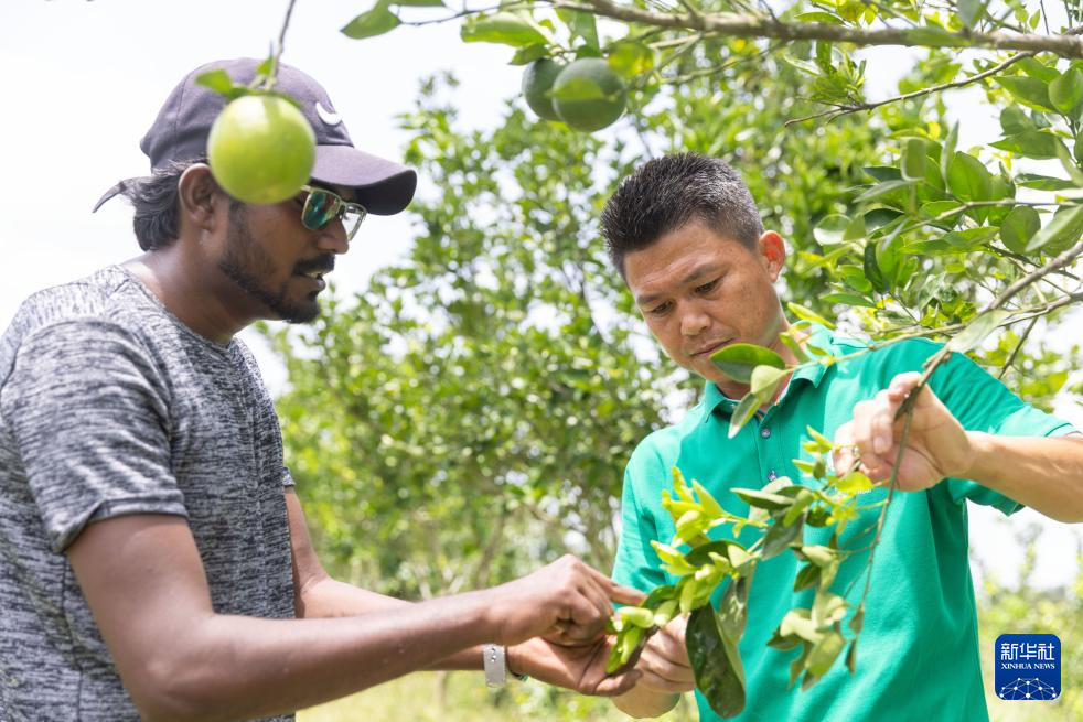 4月5日,在苏里南萨拉马卡区农户阿什温·杜基家的果园里,中国援苏里南农业技术合作中心高级农艺师杜时云(右)与农户杜基一起查看作物生长情况。