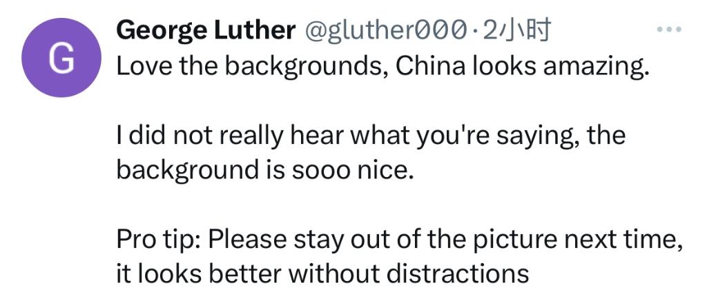 有网友让布林肯从中国带回一些让城市保持干净整洁的经验。还有网友更“毒舌”:“喜欢视频里的背景,中国看上去很棒。但其实我没在听你说了啥,背景太好看了。另外建议下次别出现在镜头里,给读者少些干扰。”
