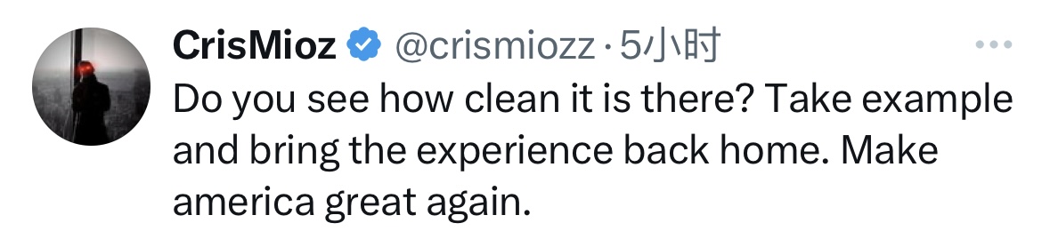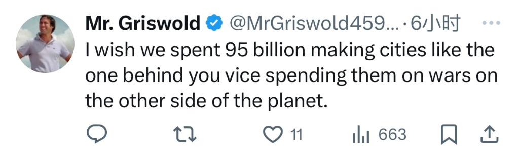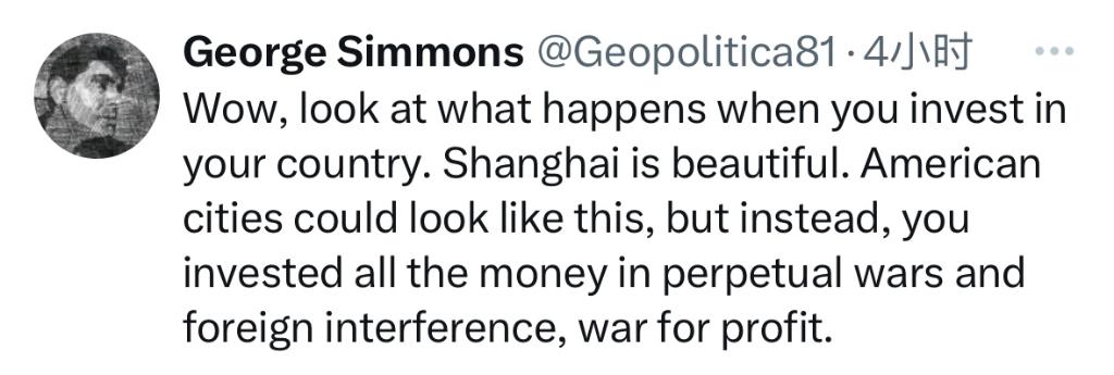 网友George Simmons和Mr. Griswold观点类似:“美国城市本也可以像(上海)这样。但你们把钱都花在无休止的战争和干预他国上,想着发战争财”;“希望美国把钱花在城市建设而不是在地球另一端发动战争上”。
