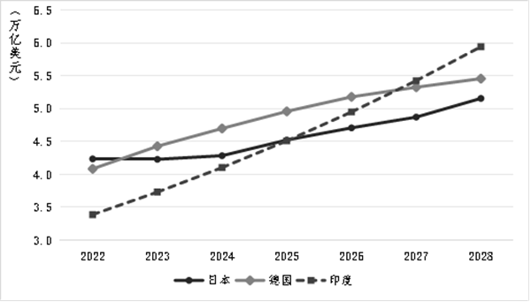 图1 2022-2028年日、德、印名义GDP的发展变化 资料来源:国际货币基金组织(IMF)