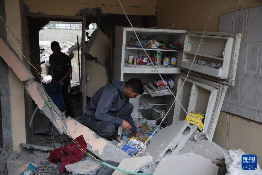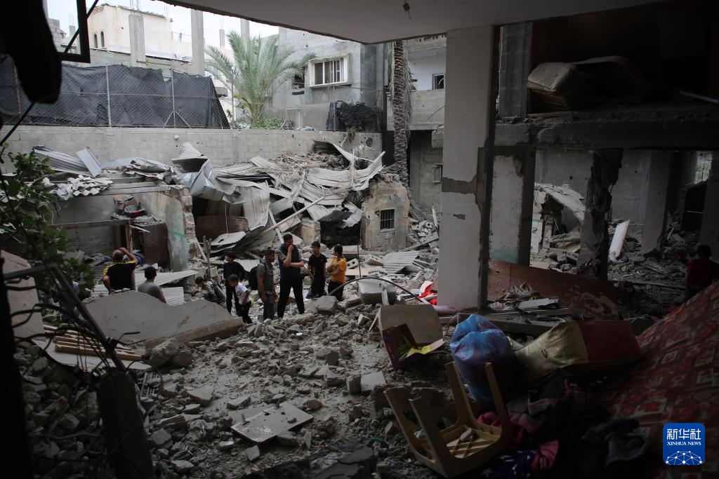 4月27日,在加沙地带南部城市拉法,巴勒斯坦人查看以军空袭后的废墟。