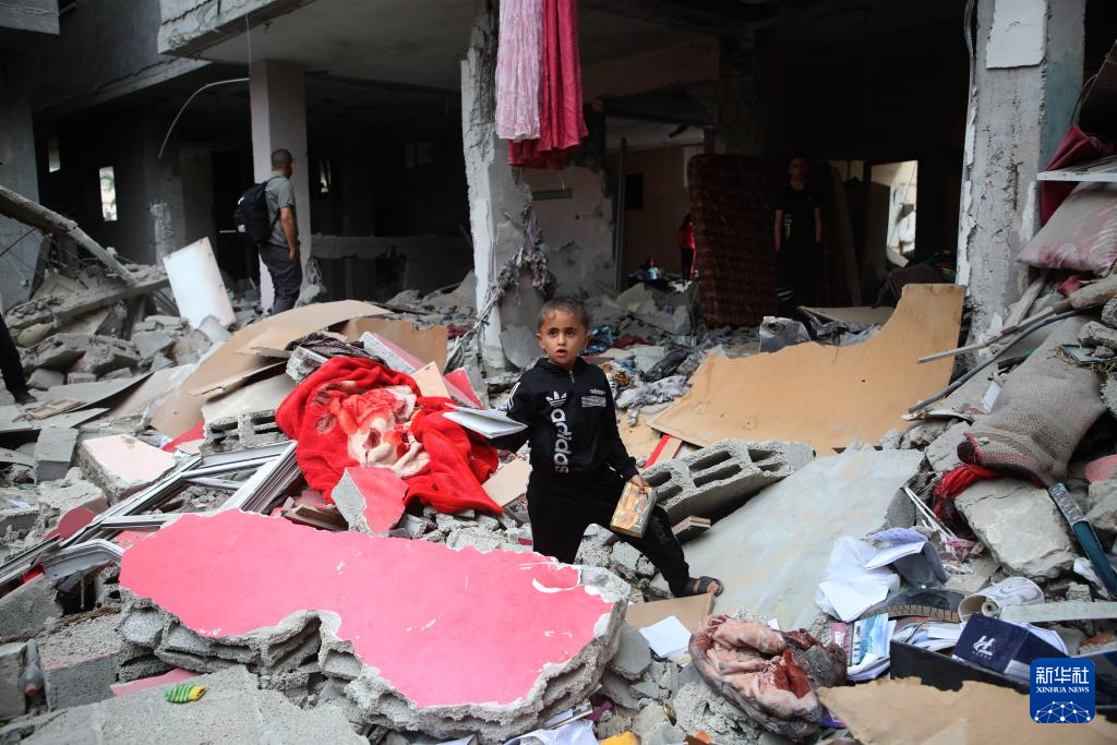 4月27日,在加沙地带南部城市拉法,一名儿童站在以军空袭后的废墟上。