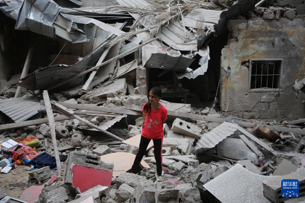 4月27日,在加沙地带南部城市拉法,一名女孩站在以军空袭后的废墟上。