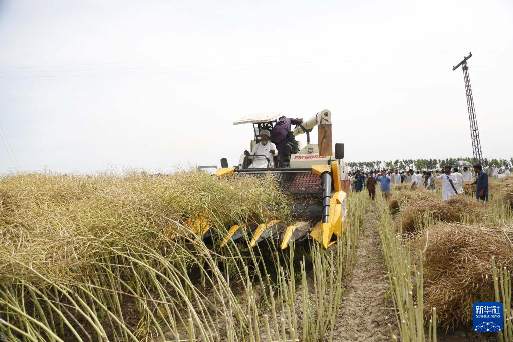 4月里,在巴基斯坦东部旁遮普省珀格尔地区一处农田,当地农民围在一台从中国引进的油菜籽收割机旁,观看机器收割作业的场景。机器一启动,地里微黄的油菜荚就整齐地倒在一旁,成熟的菜籽纷纷落在收割机的机箱里。