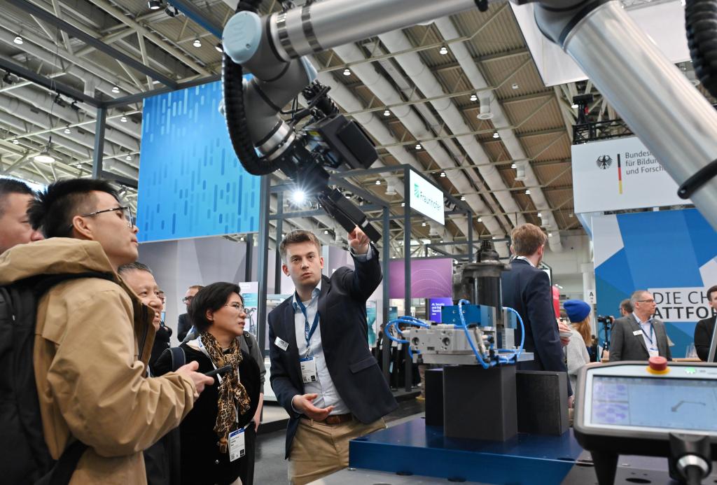 4月22日,人们在德国汉诺威工博会上参观一款智能机械臂。新华社记者任鹏飞摄
