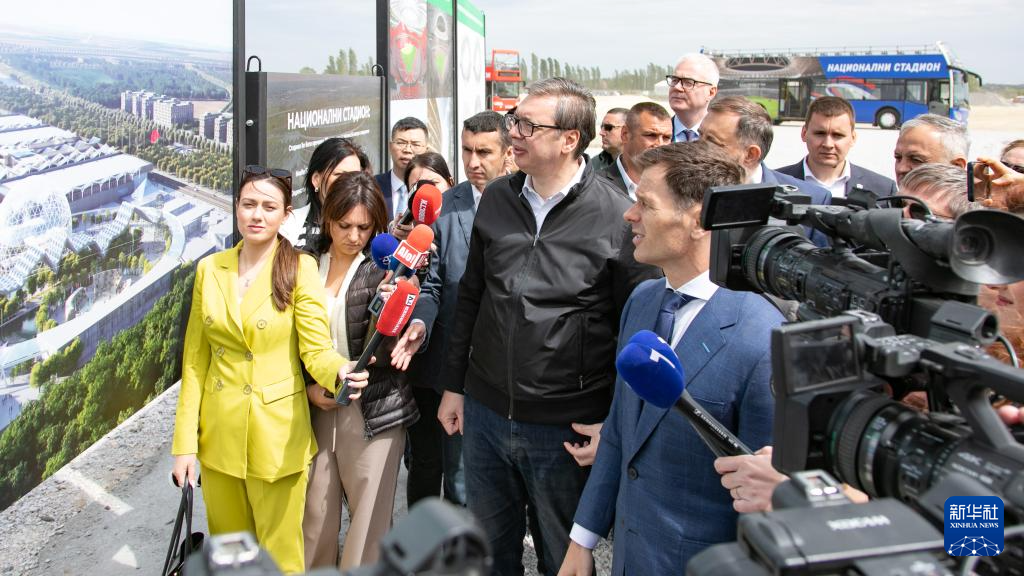 5月1日,塞尔维亚总统武契奇在贝尔格莱德举行的塞尔维亚国家足球体育场项目奠基仪式上讲话。新华社发(王韡摄)