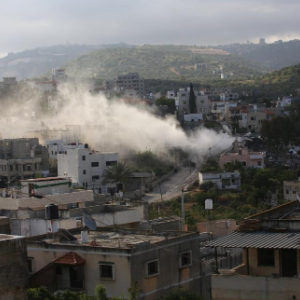 5月4日,在约旦河西岸城市图勒凯尔姆,以军和巴勒斯坦人冲突现场冒起浓烟。