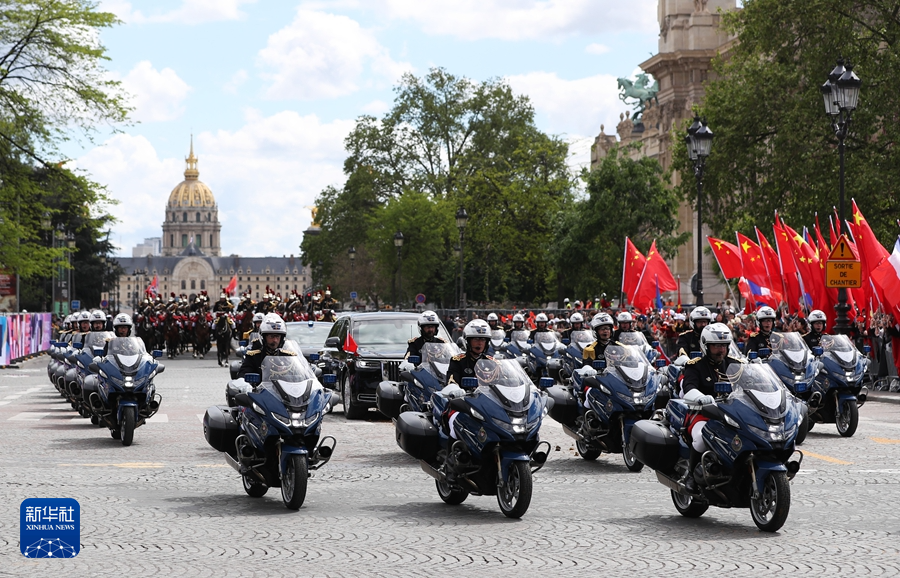 当地时间5月6日下午,正在法国进行国事访问的国家主席习近平在巴黎出席法国总统马克龙举行的隆重盛大欢迎仪式。这是欢迎仪式后,习近平和夫人彭丽媛在共和国卫队148名骑兵组成的礼兵马队和摩托车队护卫下,乘车前往爱丽舍宫。