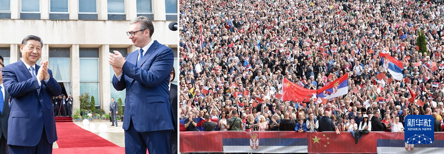 当地时间5月8日上午,国家主席习近平在贝尔格莱德塞尔维亚大厦同塞尔维亚总统武契奇举行会谈。会谈前,武契奇陪同习近平来到政府大厦平台(左图)。大厦广场上,一万五千名塞尔维亚民众挥舞中塞两国国旗,对习近平表示最热烈的欢迎(右图)。(拼版照片)
