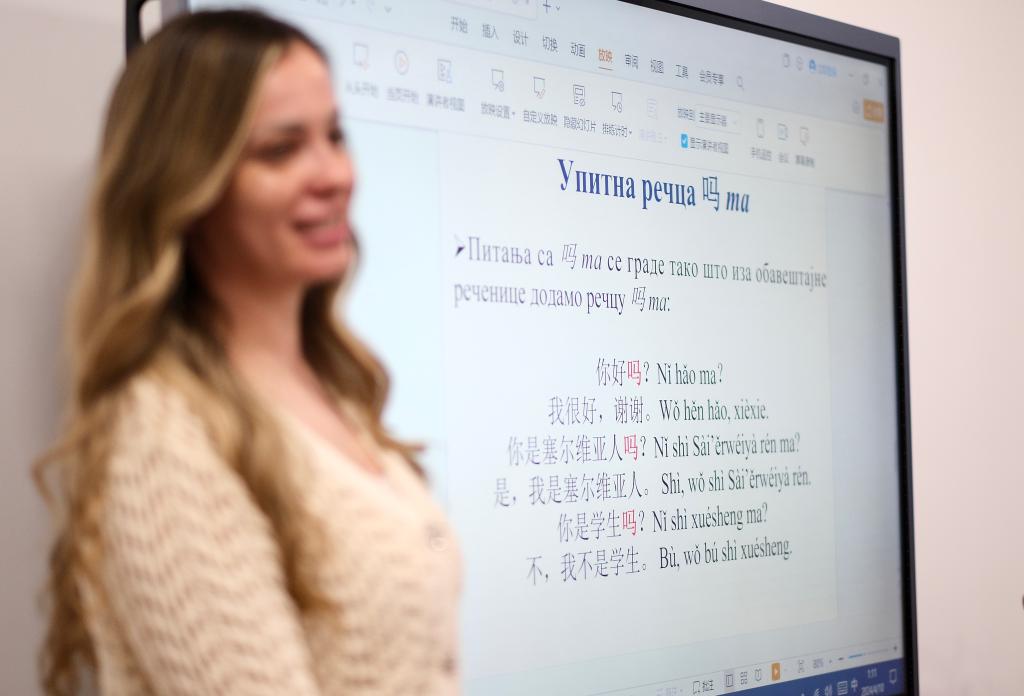 4月9日,在位于塞尔维亚首都贝尔格莱德塞中友谊广场的中国文化中心内,一名塞尔维亚汉语老师正在给当地学生授课。