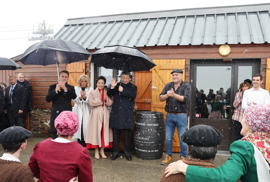 当地时间5月7日,应法国总统马克龙特别邀请,国家主席习近平乘专机来到法国西南部上比利牛斯省访问。在图尔马莱山口“牧羊人驿站”,习近平和夫人彭丽媛同马克龙和夫人布丽吉特共同欣赏当地村民表演的具有浓郁南法风情的牧羊人之舞。