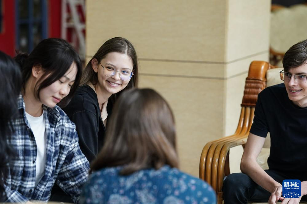 4月28日,宋智孝(右二)和胡灵月(左一)在北京首都师范大学校园内与同学交流。