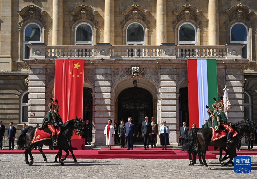当地时间5月9日上午,国家主席习近平在布达佩斯出席匈牙利总统舒尤克和总理欧尔班共同举行的隆重欢迎仪式。