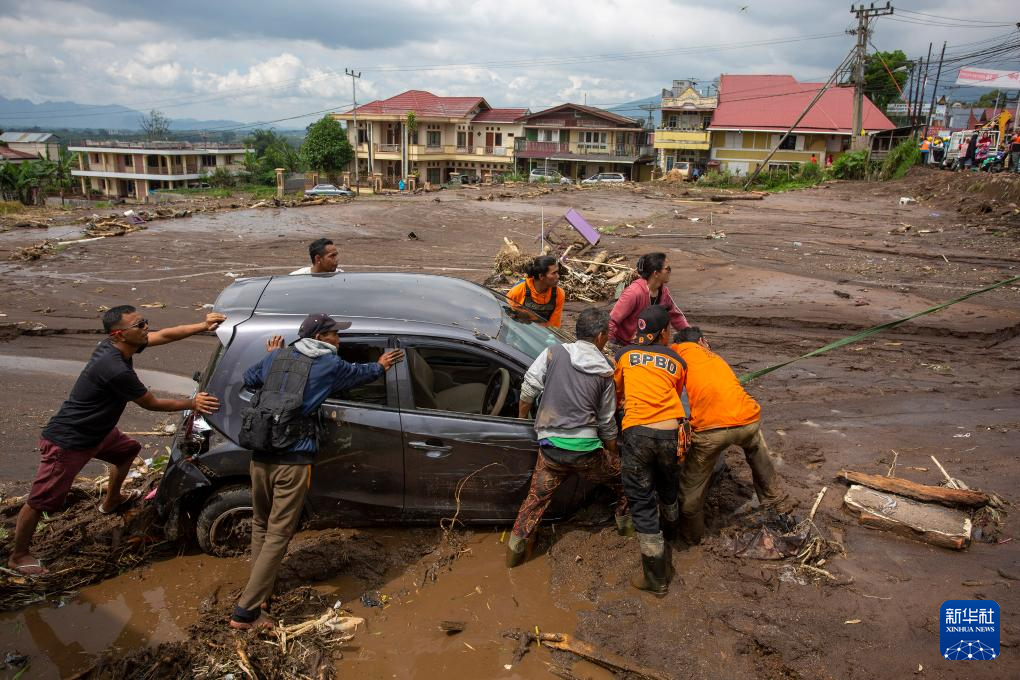 5月12日,在印度尼西亚西苏门答腊省,人们移动一辆被洪水损毁的汽车。